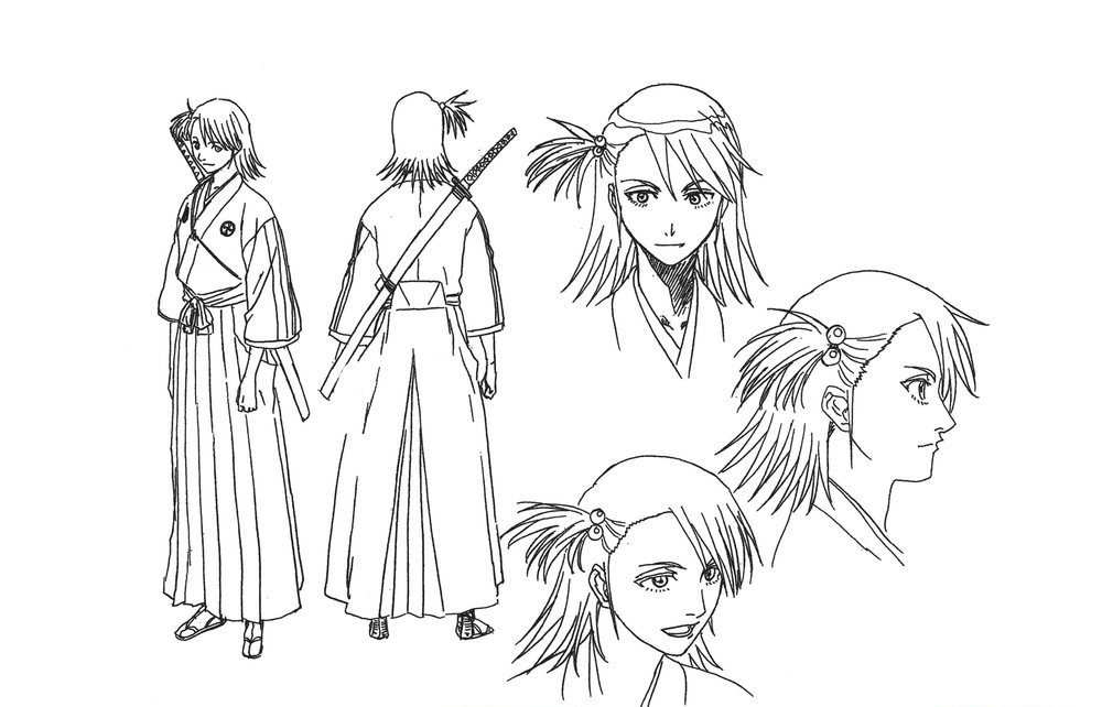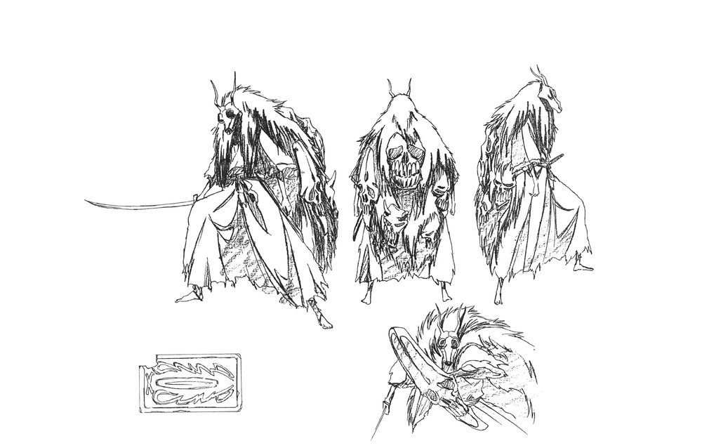 最初考虑的死神的服装是西服,男性是黑色西装,女性是天主教会学校的制服。但当时在电影中已有穿黑色西装的死神。自古以来的死神是套着黑色的布的骷髅,对此进行改变而成的穿黑色西服的死神也已经有过了。那么还没有出现过的死神的样子到底是怎么样的呢。于是就想到黑色的和服。那么与和服搭配,所以武器就选择了刀。