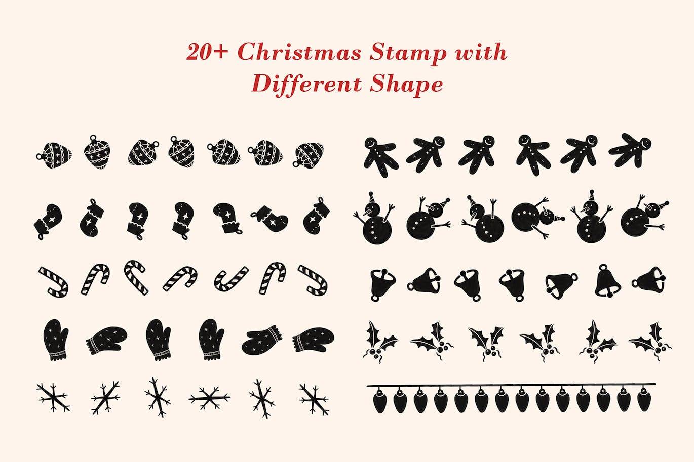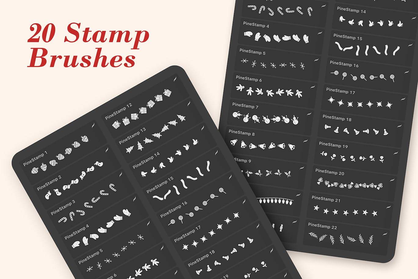 笔刷包里面包括20个笔刷和20个不同形状的圣诞节装饰元素笔刷。
