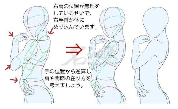 对于这类结构上看起来没有大问题,但是总感觉哪里不对的人体结构,我们可以先把隐藏的人体结构也先画出来。