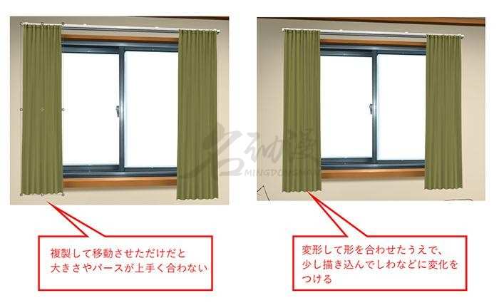 处理完第一个窗帘后,复制并移动到另一侧即可。注意透视和光源要和大环境统一,同时尽量对褶皱的结构做一些小的调整,否则会感到很别扭的。