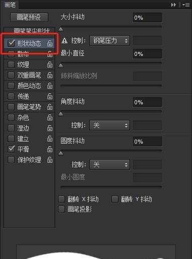 画笔的调整栏中,有一个“形状动态”,点击进去我们还可以调整画笔。