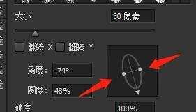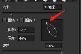 可通过拖动框内的圆形进行调整,比如我们现在想让笔刷效果“扁”一些,那么就拖动圆上的两个点: