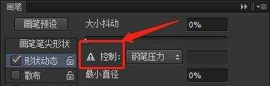 随机无规律画笔在选定的数值内出现的大小,0为不随机,100为最大随机值,控制里的钢笔压力需要打开板子才会有压感,如果控制左边出现一个小三角形就是指无压感。