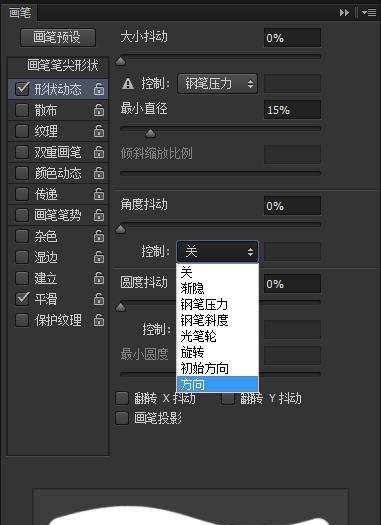 比如我们要画一团灌木丛的话,可以在形状动态的“角度抖动”设置为“方向”: