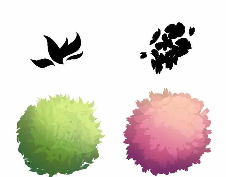 用下面这两个自制的笔刷,画下面的灌木丛和花团,效果明显就要比我们直接用19号笔刷一点点扣,来得快很多了: