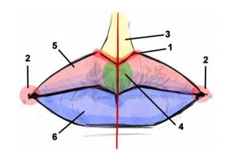 5和6分别是上嘴唇和下嘴唇,是嘴巴裸露很多的部分。