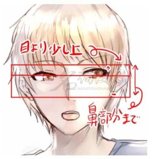 耳朵的位置我们可以参考着看,从正面看它是位于头部两侧,高度位于眉弓骨与鼻子底两者的中间,一般是位于头部的二分之一处下半,耳朵的长度约是头部的四分之一,正面看是三庭五眼的大小。正面如图下: