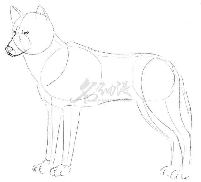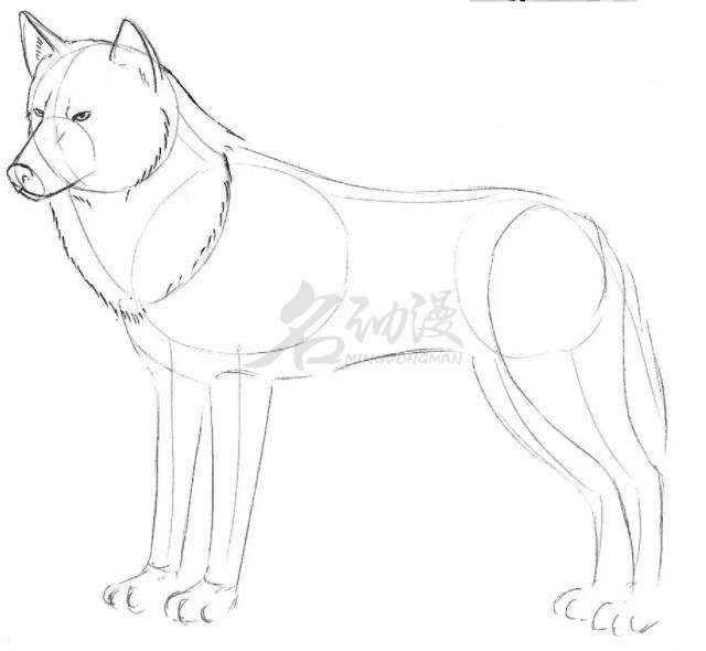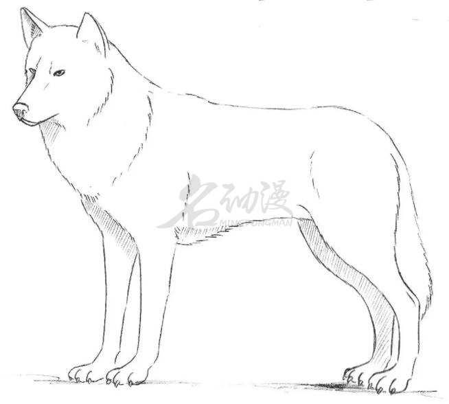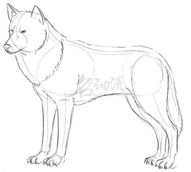 最后一步:接下来可以使用勾线笔或色号深的铅笔画出以上上面的步骤,描绘出狼的轮廓,再用橡皮擦,擦去辅助线。就开始塑造阴影和高光细节等。如图所示: