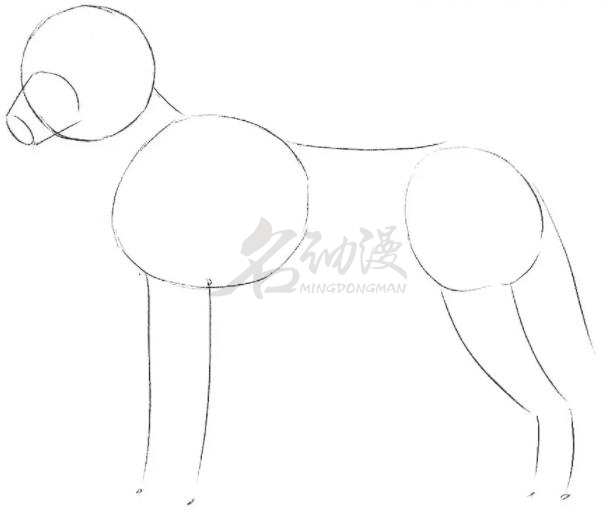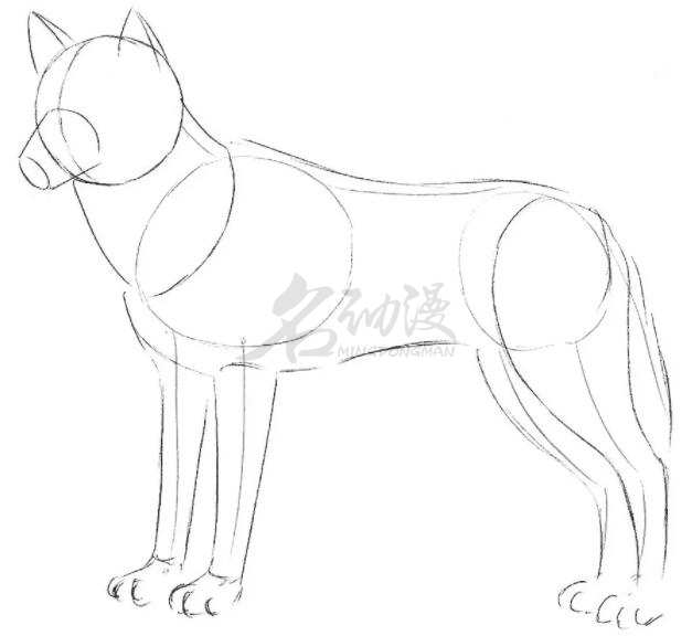 第一步:因为我们经常画人物,都是先从骨骼姿态开始画,那么动物也是这样的。例如狼,首先用圆形的形式表示头部,在头部前用圆柱体表示狼的鼻子与嘴的部分,以圆柱的形式作为胸部和臀部,头部和胸部连接处勾勒出颈部的轮廓,接下来颈部连接脊柱,再连接尾部。画好大体的部分就勾勒出四肢。如图所示: