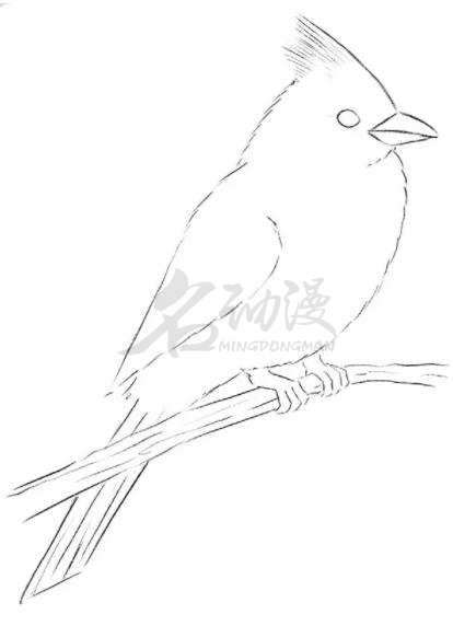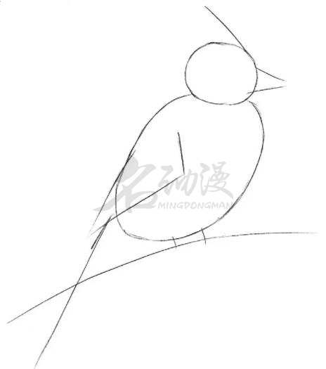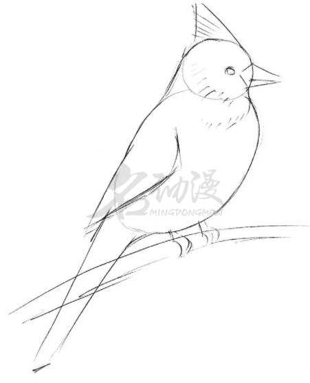 第二步:在头部画出鸟的嘴,像个翻转的八字。头顶上绒毛千万不可以忽视掉的,再身体处画出翅膀的轮廓,形状像个三角形,以后画出鸟的长尾巴和两条短腿,以及鸟脚下所在的树枝。如图所示: