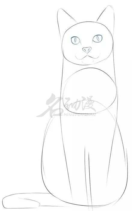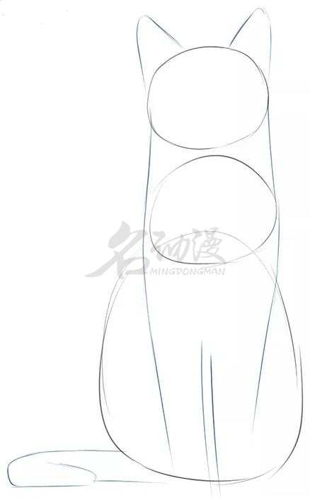 第二步:在两个相同大小的圆两侧画出两条垂直的直线,稍稍朝向外,有点八字的感觉,接着在八字的尾端画两线作为猫的前肢轮廓,这次的两条线要朝向内,就像倒过来的八字,之后在头部的圆上画出猫耳朵的轮廓,猫的耳朵看起来像一对三角形,所以画的时候可以参考三角形来画。接着画出猫的尾巴。如图所示: