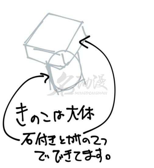 画蘑菇技巧:有了大概的形状后,我们就可以在原来的基础上画出蘑菇的样子,注意蘑菇的伞帽与正方体相比是比较圆润的,圆柱体的伞柄为了更加贴切蘑菇的样子,可以将尾部画得稍微大一些。