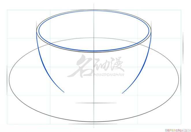 确定好杯子的大小高度之后,我们继续画出杯子的形状。在上面的椭圆形内部,勾勒出一个较小的椭圆形表现杯子的厚度。继续用平滑的线条,画出咖啡杯的形状。