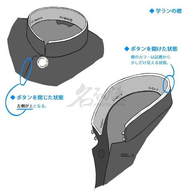 常见的立领是被2个挂钩固定的,因此不容易脱落。又因为内领是重叠的,所以面料显得比较硬。这种立领常见于中山装或日本昭和时代的学生校服上。