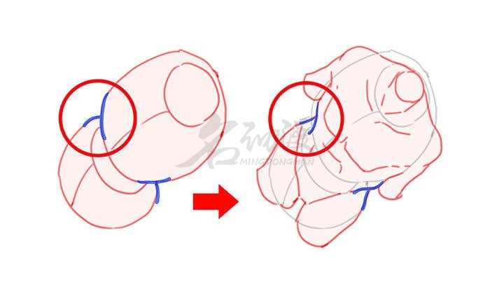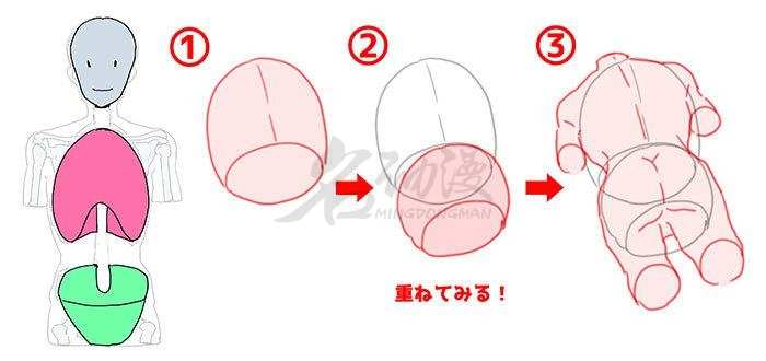 第二步:挑选的人物角度是特别夸张的俯视或仰视,肋骨与盆骨两大体块发生重叠时,要注意腰线的刻画,区分两大体块的前后或上下位置。
