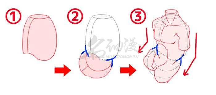 第一步:绘制人体时,将体块分成肋骨与盆骨两部来思考画画的话,复杂的人体结构就会变得容易理解起来。首先将肋骨和骨盆两个体块放在一起,随后画上肌肉,画出腰线,这样就画出人的身体啦。不管画什么动作都可以使用这个方法,如果是比较复杂的动作可以参考真实的照片进行刻画,第一步就是找出人体最重要的两大体块,第二步注意体块之间的透视关系,这样画起来很容易得到事倍功半的效果哦。