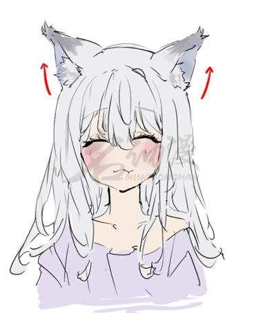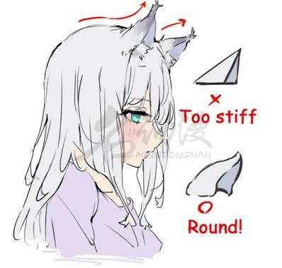 第三步:狐耳不管何时何地都不应该是直的,画画时要注意,处于放松状态下的狐耳应该是带点弧度,而不是僵硬的三角形。小技巧:在你的角色上画狐狸耳朵时,可以用头发遮住脸的侧面,这样可以很好解决你角色出现四只耳朵的尴尬场面。