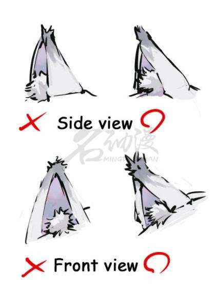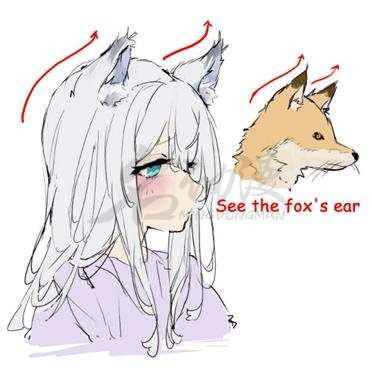 第二步:狐耳并非像道具一样镶嵌在狐狸的脑袋上,狐狸的耳朵在它们进行野外狩猎时提供了许多帮助。让我们想想狐耳是从哪里开始的。真正的动物的耳朵是从头后部开始,向前面倾斜,耳朵里面也有绒毛,如下图所示: