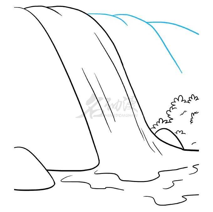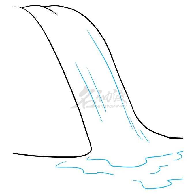第一步:瀑布是指从山壁上或河床突然降落的地方流下的水,首先我们画出瀑布两侧的山壁,然后画出水流的流向,最后画上流水到底部时荡开的水纹,这样一道瀑布的雏形就画出来了。