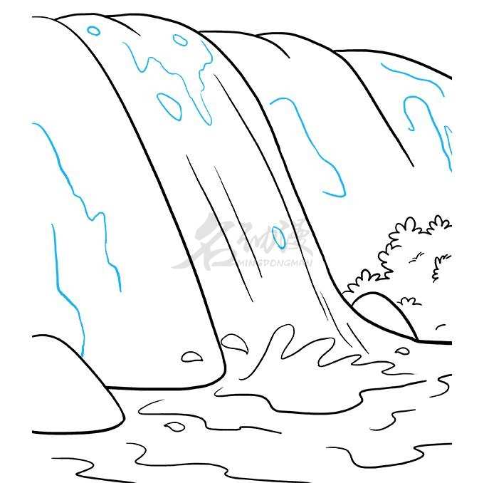 第三步:增加细节。要塑造出河流的湍急以及冲击力,我们在水面上画出流水的动向,如下图蓝色线条显示。然后在河流下端画出溅起来的水花,以及向四周扩散开的水纹,最后给山体画上一些小细节,这样一个瀑布的线稿图就画好了。