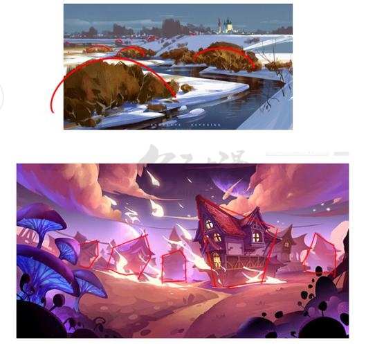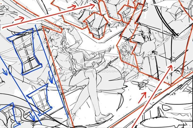 而蓝线区域的透视则是从上到下的,所以蓝色区域就由上大到下小的形成了画面纵向透视关系。