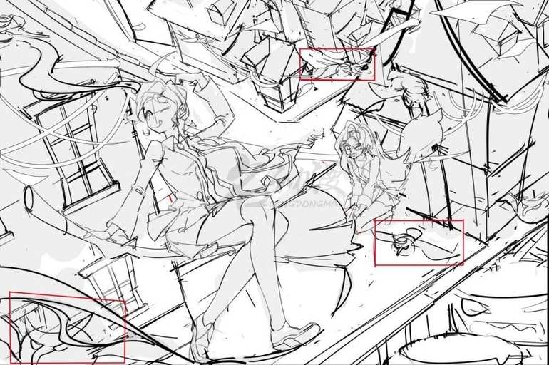 如图下所示,红线部分的透视是右边的,那么红线区域就由于远近关系的变化,前面的房屋与后面的房屋在视觉上形成了遮挡关系。