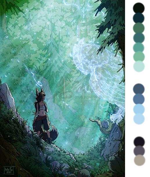 大概意思是确定一个颜色作为整个画面的主导色,如下图所示:一眼可见该作品以绿色为主色调,绿色的占比最大,紧接着是蓝色也就是所谓的辅色调,最后才是点缀色黄色。其中最深的颜色是墨绿色,最浅的颜色是浅青色,绿色贯穿了整个画面,使得该作品看起来完整度很高、颜色十分和谐,没有突兀的地方。