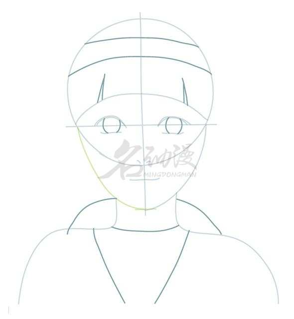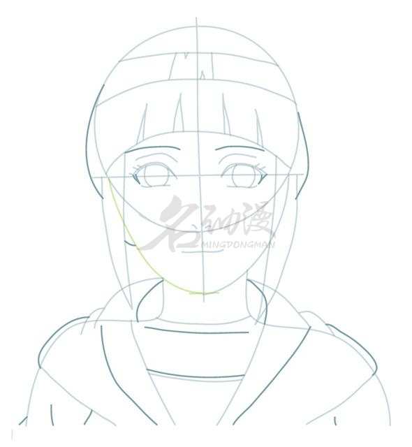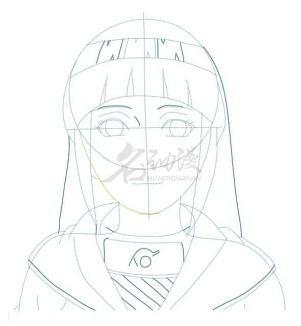 第一步:首先概括出日向雏田的整体轮廓,然后在面部画出五官定位线,在横线上画出日向雏田的眼,再画上鼻子和嘴巴。最后画上刘海以及头发上的高光,再画上衣领。