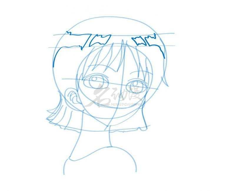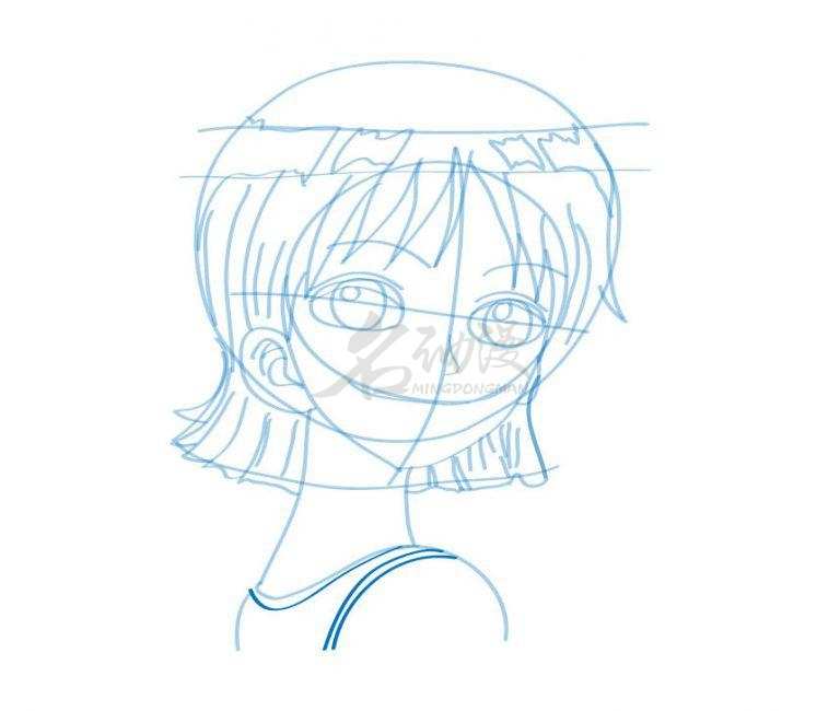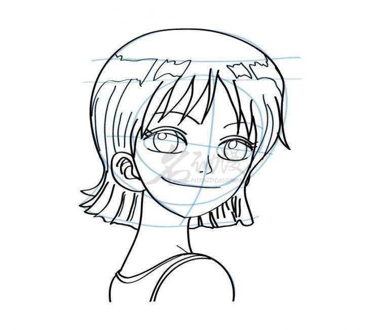 第一步:首先用圆形概括出娜美的头部轮廓,画上十字五官定位线,到画出眼睛的位置以及头发的外轮廓,最后画出脖子和肩膀。这样娜美的外部轮廓就画好了。