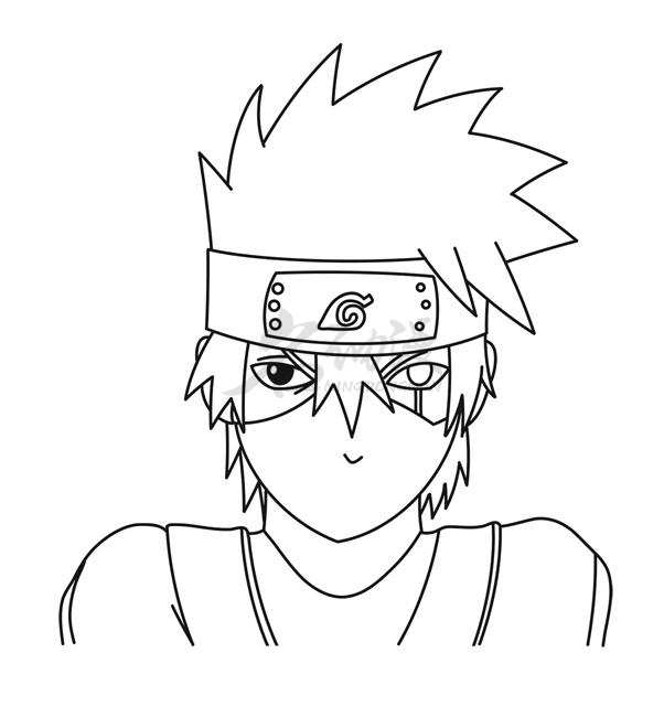 第三步:在上一步的基础上继续完善细节。首先将卡卡西护额上的木叶标志画出,然后将护额右边的三角形刘海画出来,紧接着是卡卡西的面罩和眉毛,最后画出卡卡西的衣服。