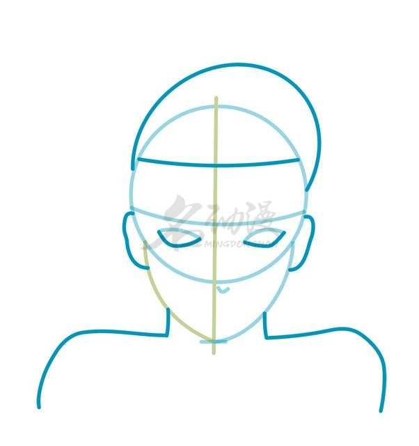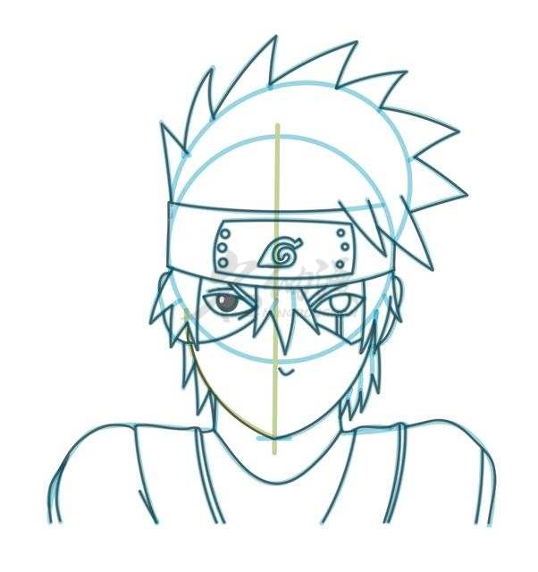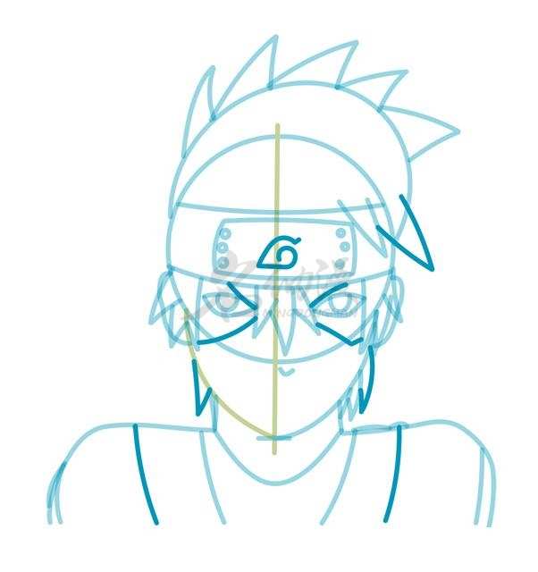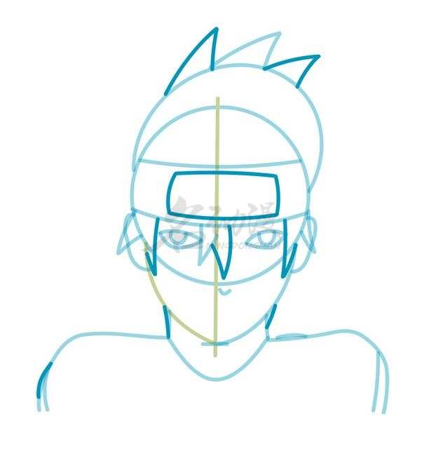 第一步:首先用圆形概括出卡卡西的头部,然后用一个椭圆形概括出卡卡西头发的位置以及护额的位置,然后画出脖子到肩膀,最后确定五官的位置。这样,卡卡西的轮廓就画好了。