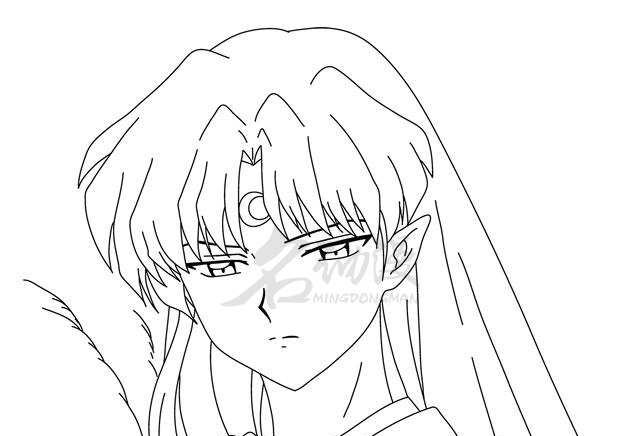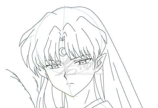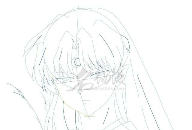 第三步:深入刻画。首先细化刘海部分,丰富头发的层次感,再到散发的发丝,然后加深杀生丸的上眼睑和画上眉毛,再将额头的月牙画出来,最后细化左边的绒毛和衣领,这一步杀生丸的草稿就画出来了。