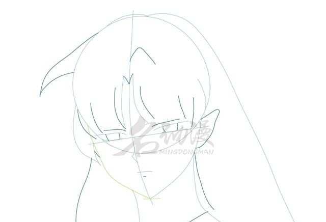 第一步:首先用线条初步概括出杀生丸的头部轮廓,然后画出头发的发丝走向以及刘海,然后画上五官与衣领。