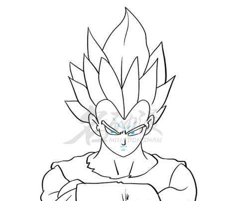第四步:这一步十分重要,我们先画出贝吉塔像倒三角形一样的身体,然后是五官。贝吉塔的设定是高傲、冷酷到近似无情,在刻画他的五官时我们也要将五官画得凌厉些,塑造一幅生人勿进的样子。到此,贝吉塔整体线稿就画完了,可以进行下一步的上色工作。