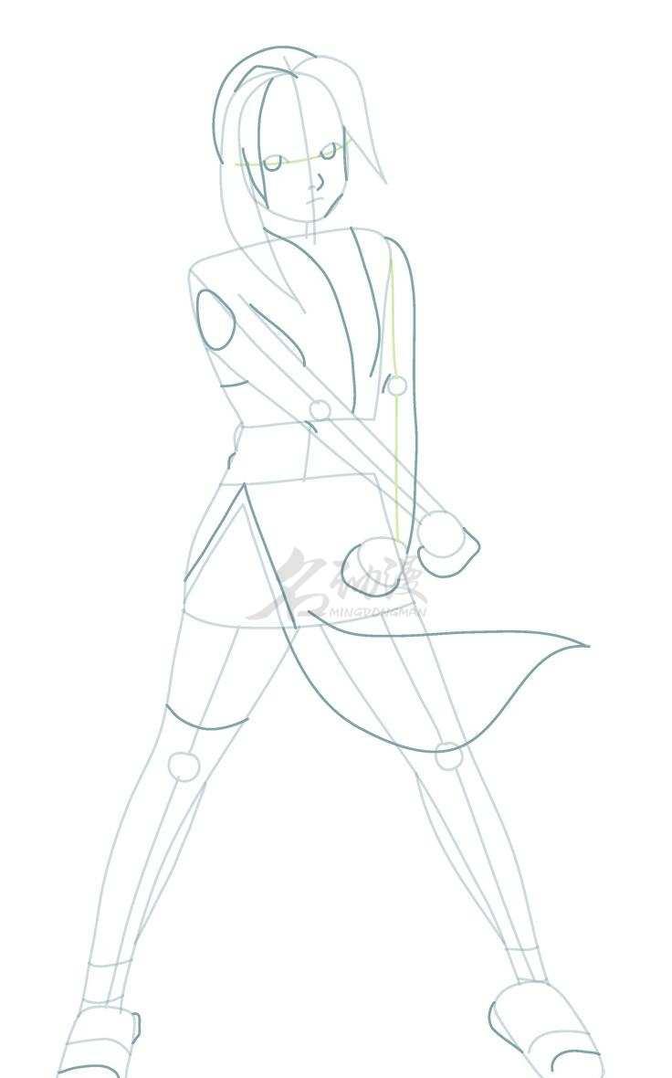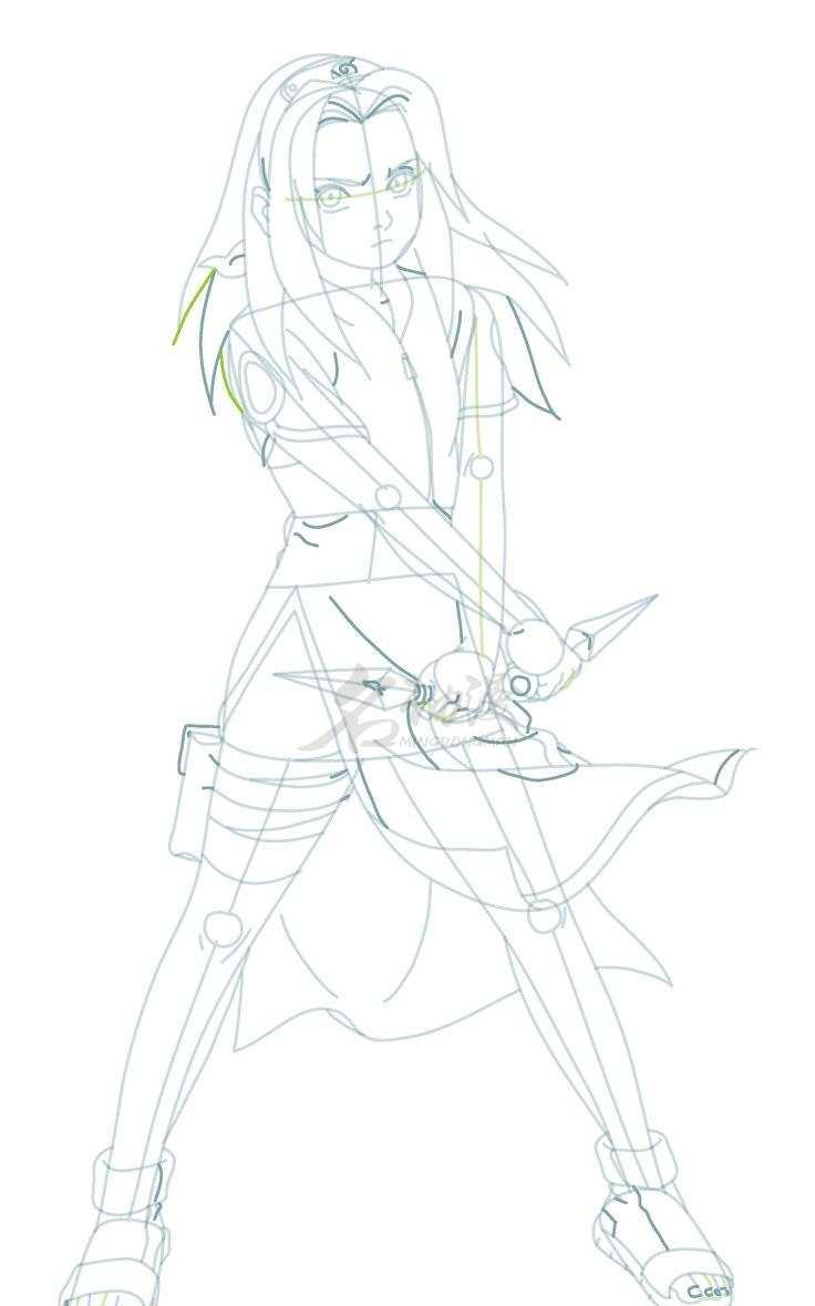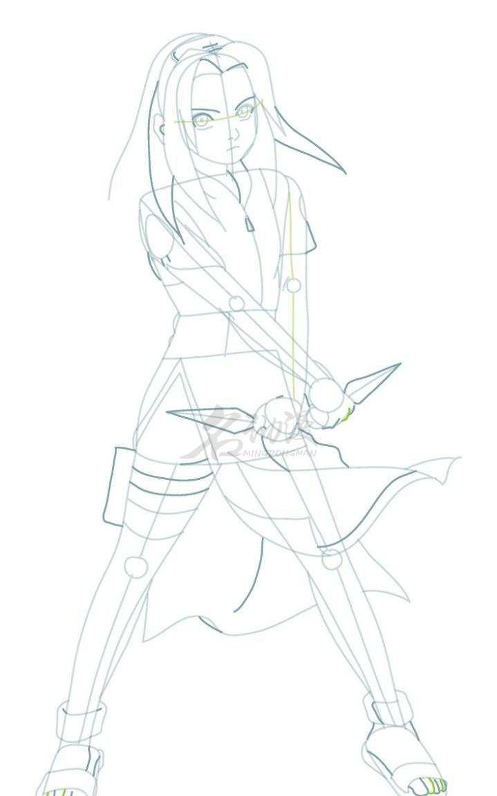 第一步:用粗略的线条概括出春野樱的人体动作以及主要的衣服褶皱,然后画出最主要的几束头发,最后画上五官的轮廓,为下一步的刻画奠定基础。