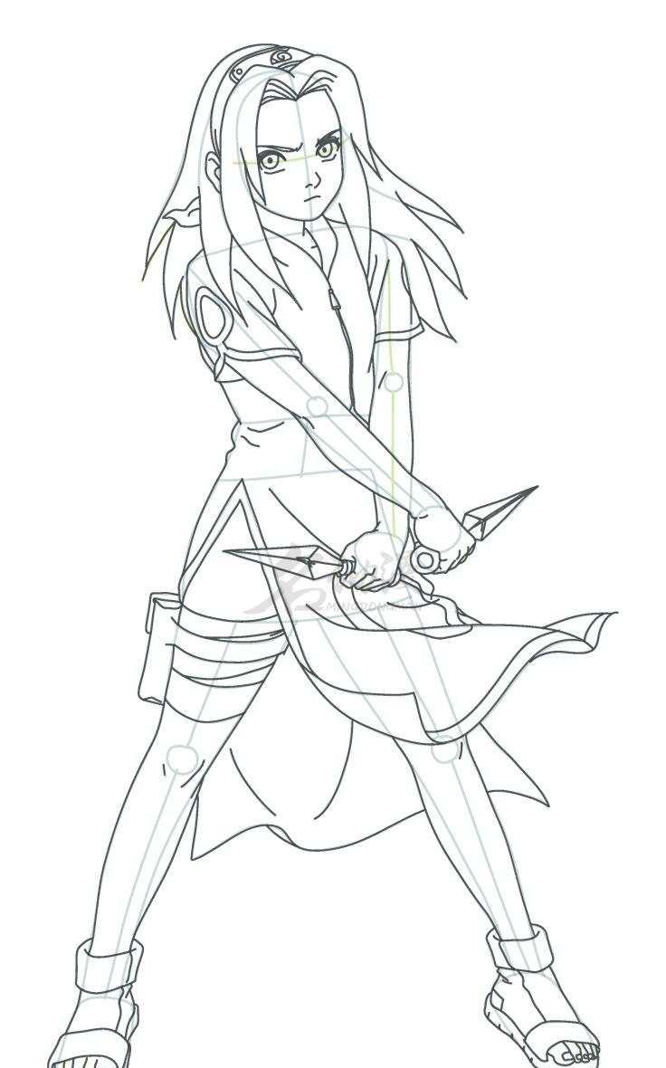 第二步:首先画出春野樱的眼睛和眉毛,然后是嘴巴和鼻子的部分,这样脸部就大体画好了。接下来开始画春野樱的头发,为了表现层次感,可以将头发分成几束来画,这样前后关系十分明确。再然后画出衣领和裙摆上的细节,例如绑在大腿上的缠带和武器包,最后画上武器苦无以及鞋子和脚趾。