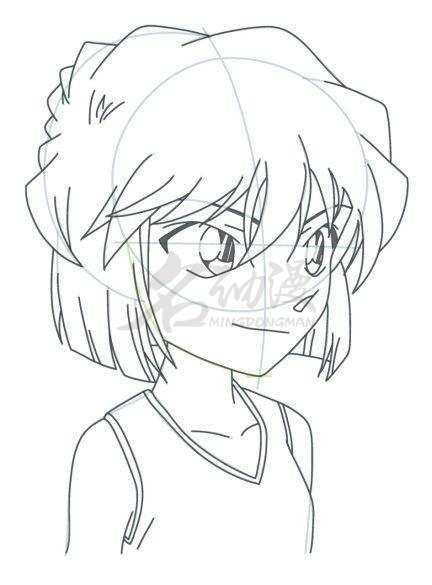 第二步:首先在灰原哀的后脑勺处画一个半圆确定头发的厚度,然后分别画出最主要的三簇刘海,再画出瞳孔,最后画上灰原哀的衣服。