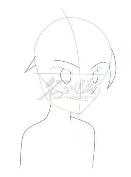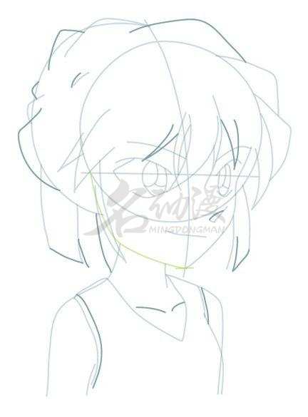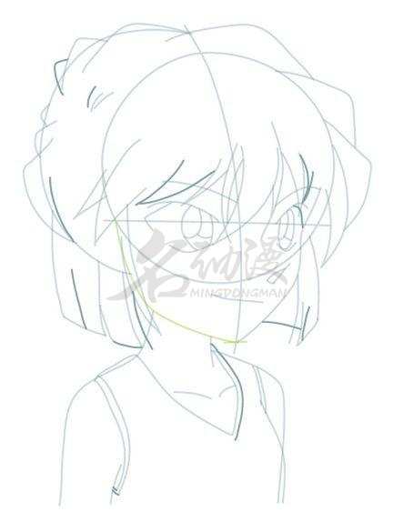 第一步:不管画什么,第一步要做的事就是先起型。首先将灰原哀的整体造型粗略地画出来,然后画好十字五官定位线,在五官定位线上画上五官。