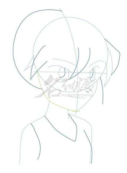 第三步:增加细节。首先在后脑勺出找到发旋的位置,然后画出错落有致的小角,再将短发画出来,最后增加刘海以及衣服的细节,最后的最后画出眼睛和鼻子以及锁骨,灰原哀的雏形就出现啦。