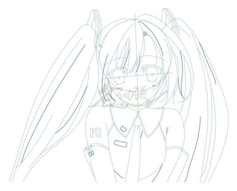 第四步:深入刻画细节,首先塑造头发的层次感,然后把衣服的细节也整理出来画上。这样初音未来的草稿就基本绘制完成啦。