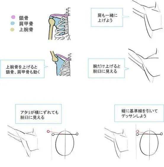【锁骨和肩膀的联系】在画手臂抬起的角色时,对肩膀有不协调感的人,可能是锁骨的位置。