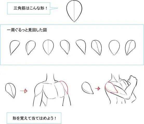 然而,与此相反,三角肌(肩部肌肉)很少改变它们的形状,无论它们做什么运动。因此,把三角肌的形状记下来,你可以从任何角度画画,在细微的结构和动作的规律性上,让人头疼的机会就会减少。