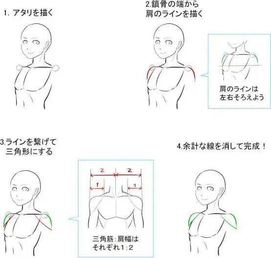 请注意上面的内容,然后试着去画一个肩膀吧!