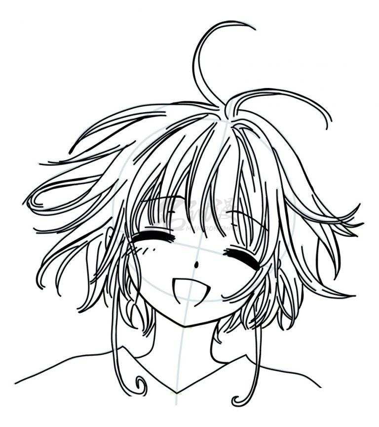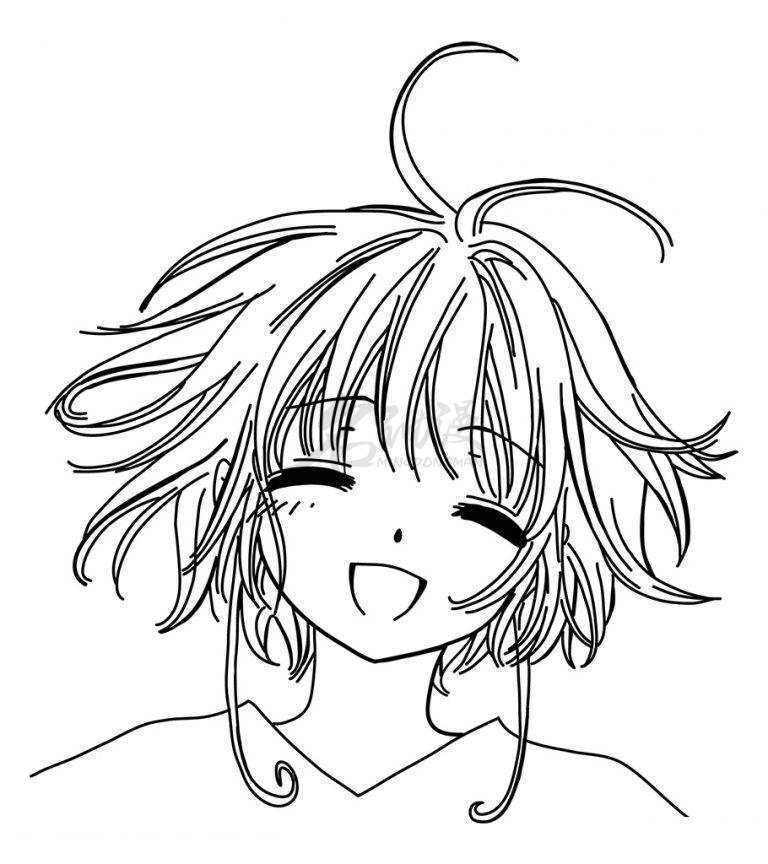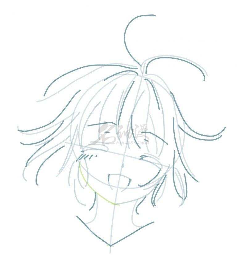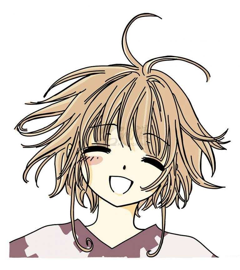 第二步:到这一步,我们先刻画小樱的五官,将五官的细节比如眉毛和上眼睑画出来,然后是微微张开的嘴巴和脸颊上的红晕;再到将头发的细节画出,让头发看起来更飘逸,最后画上脖子和衣领。这样小樱的雏形就画好了。