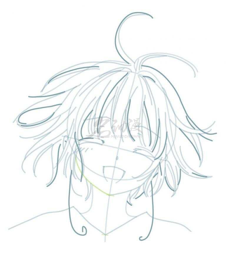 第三步:丰富头发细节,打造层次感,如下图深色线条部分,先将主要的发丝画出,然后完善衣领到脖子部分。到这里小樱的草稿就画好了。