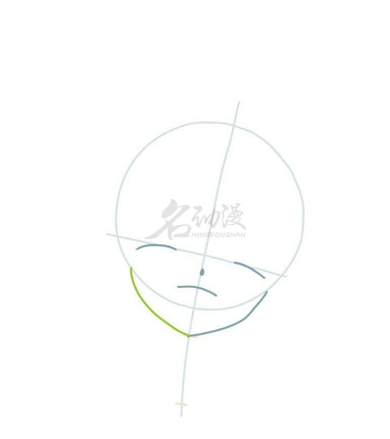 第一步:首先用圆形概括出小樱的头部,再在圆形的下面画出脸型,然后到在圆形的三分之一处画出十字五官定位线,最后用简单的笔画画出眼睛、嘴巴和鼻子的位置。