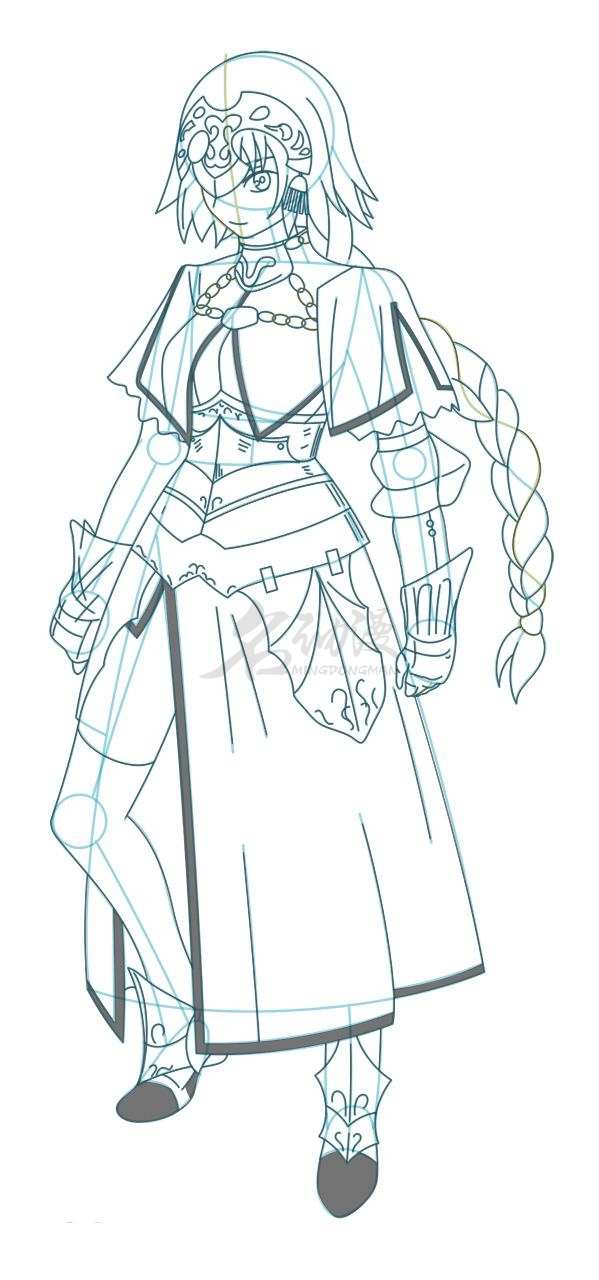 第一步:首先构思好贞德的动态以及整体的造型,再画出裙摆和腰带的雏形,然后画出头部的铠甲和头发,最后勾勒出五官的造型。这样,贞德的雏形就画出来了。