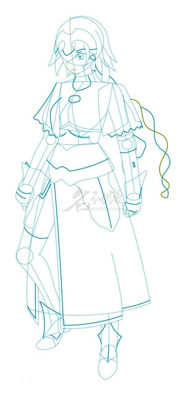 第四步:丰富铠甲与衣服的细节,在裙摆上画出褶皱,最后将马尾辫画出来,这样,贞德的草稿就画好啦。