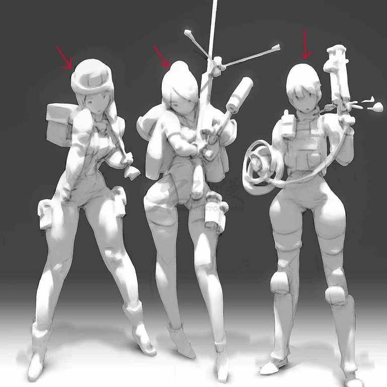 把人和装备简化成几何形,这样投影(二分)下来的形状不会太碎,更整体一些。如果按照规律来,确实会产生某些投影,但这些投影又会让整体的二分显得细碎,这时我们应该主观地处理掉它,以画面整体为主。如下图所示: