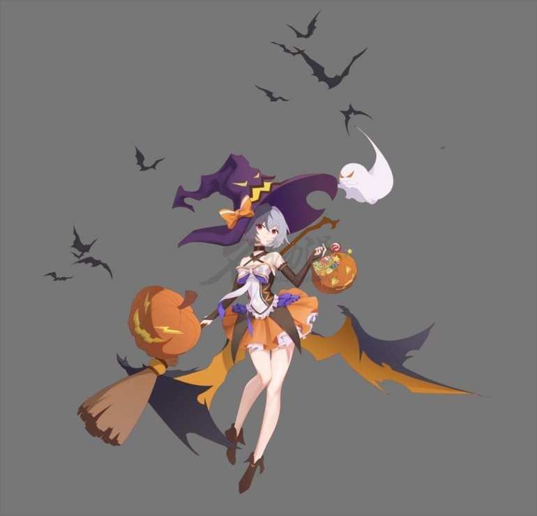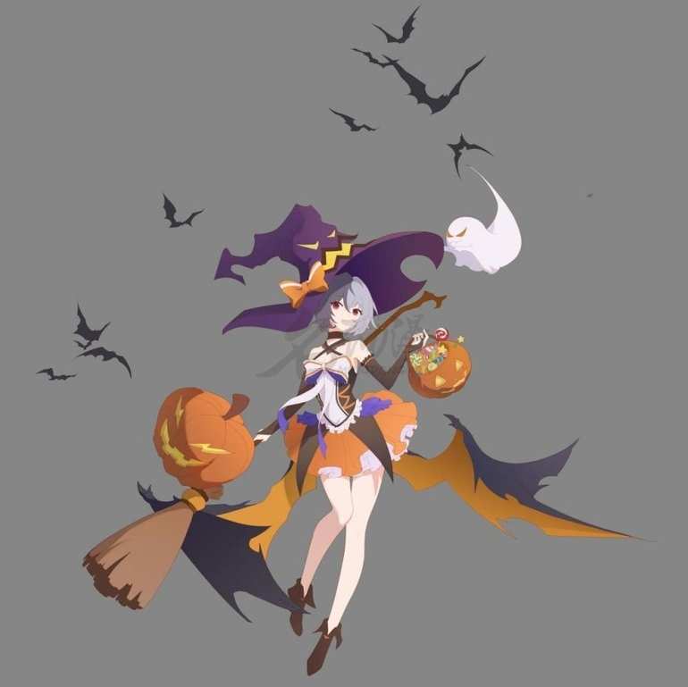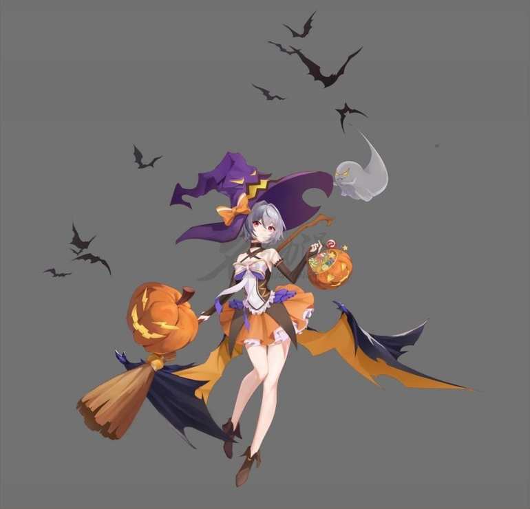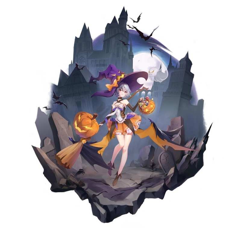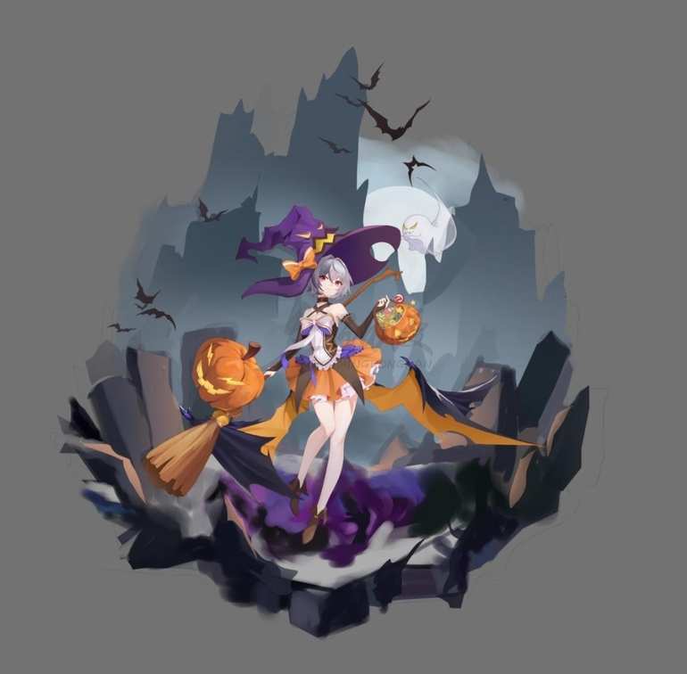 背景大概关键词选择为:冷色调的、城堡。房子:哥特式的尖顶、月亮、墓碑、碎石等等。偏冷色调的夜晚的背景 和服装的暖色有个对比。